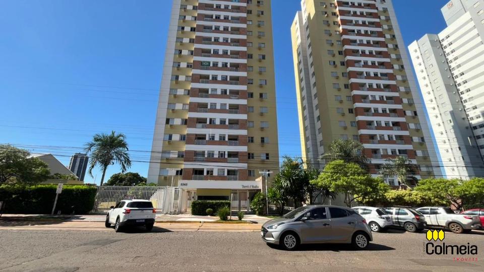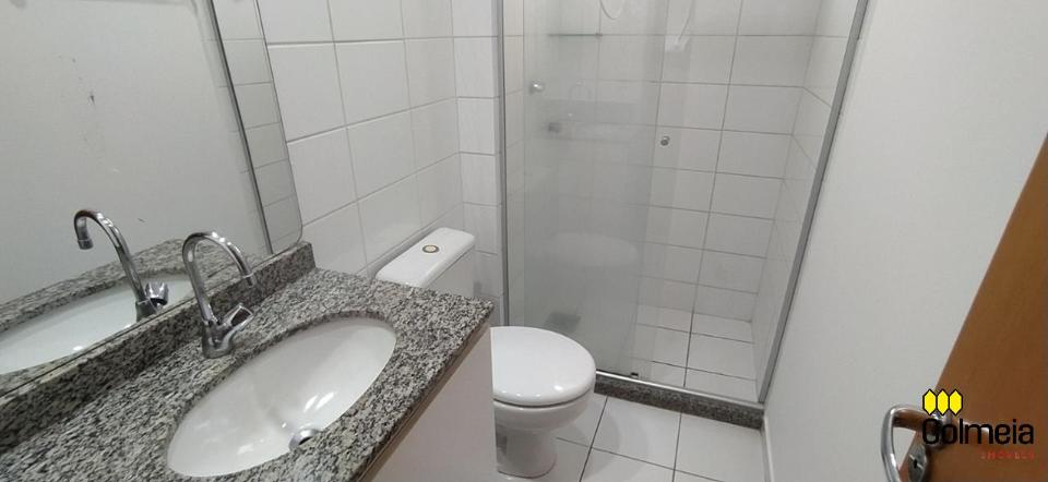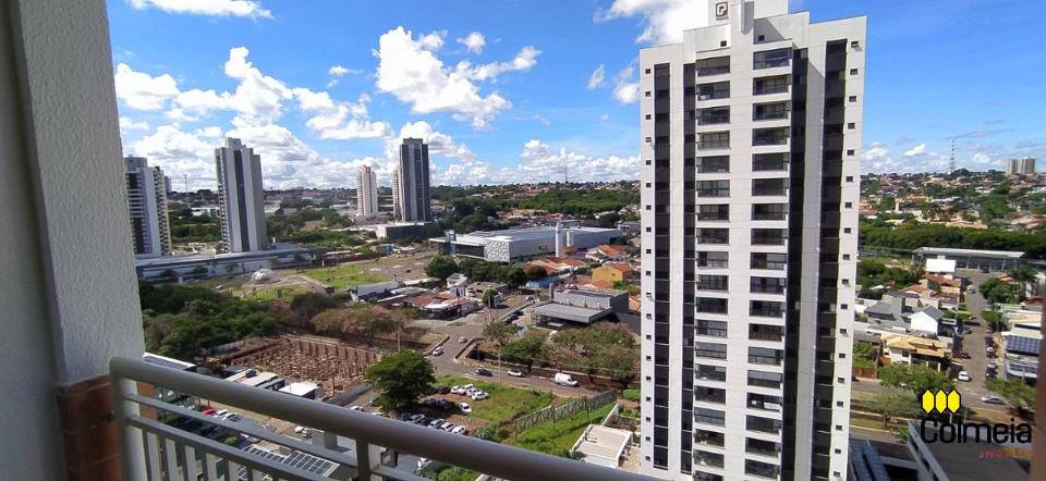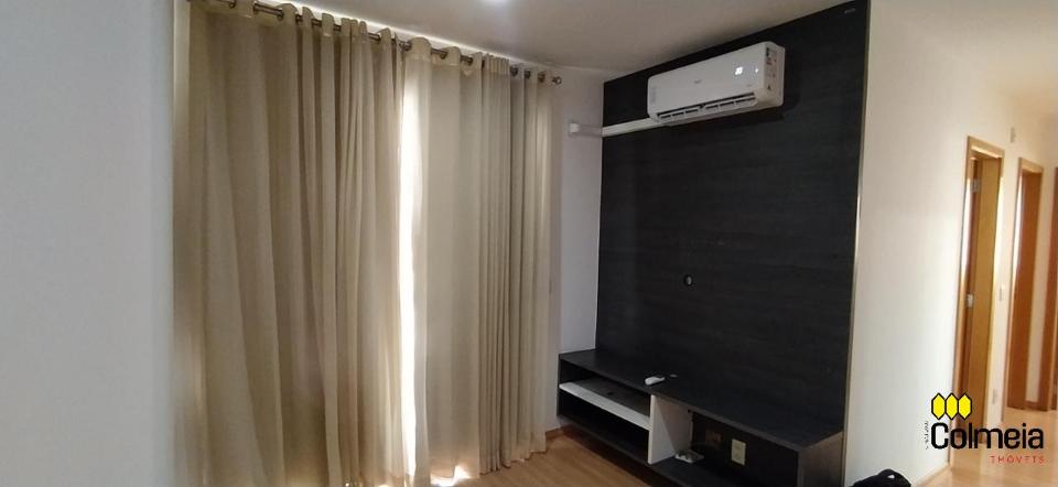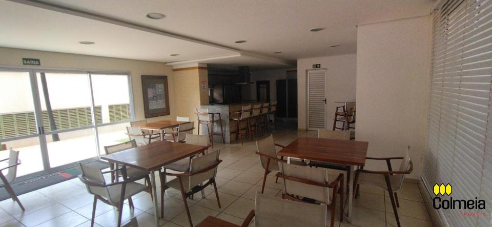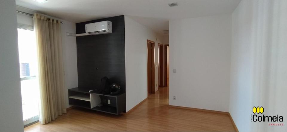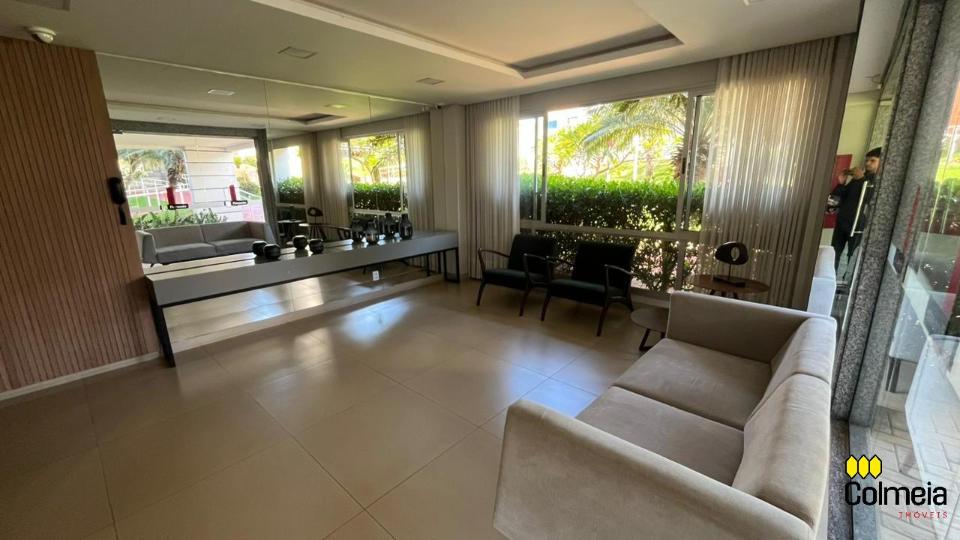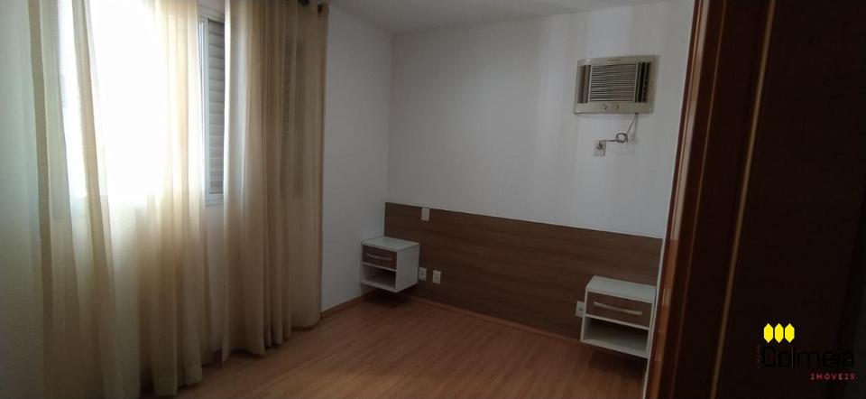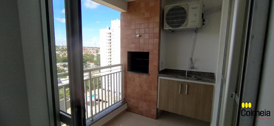 Sala de estar ampla com ar condicionado, sacada com churrasqueira privativa e área de serviço, banheiro social com box de vidro e armário na pia, uma suíte com armário embutido e ar condicionado, banheiro da suíte com box blindex e gabinete na pia, quarto com armário embutido e ar condicionado, cozinha com armário embutido e garagem coberta para um veículo.